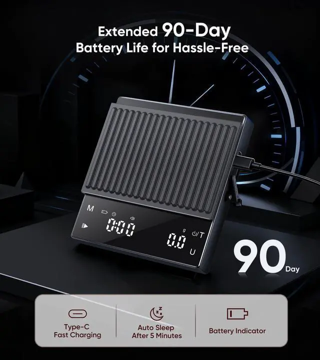 Small Espresso Scale:With its sleek, ultra-thin profile, this coffee scale effortlessly fits beneath most espresso machines and compact pour-over stands. Whether tucked under your machine or nestled beside your travel mug, it saves precious countertop space