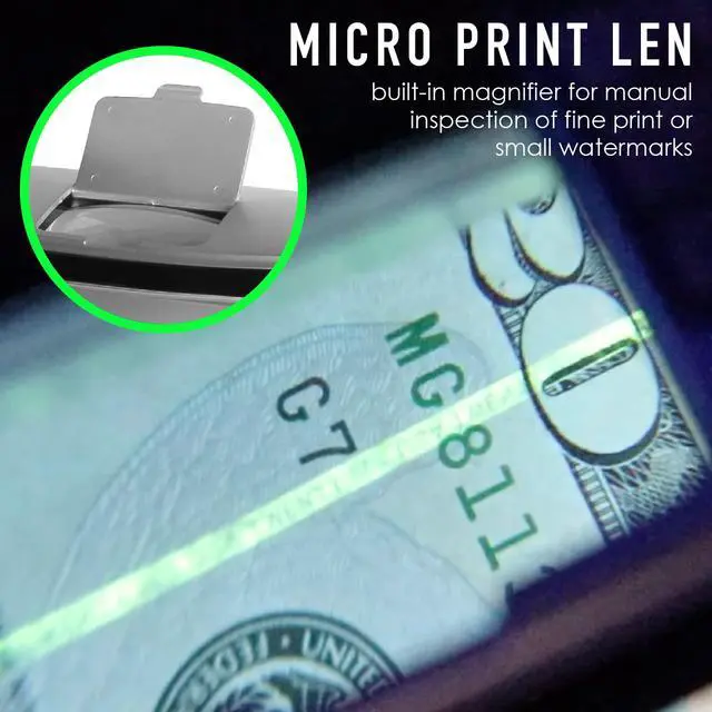 Built-in micro print convex lens magnifier for manual inspection. Makes it easy to read fine prints or watermarks manually with the aid of fluorescent lighting illuminating surface.