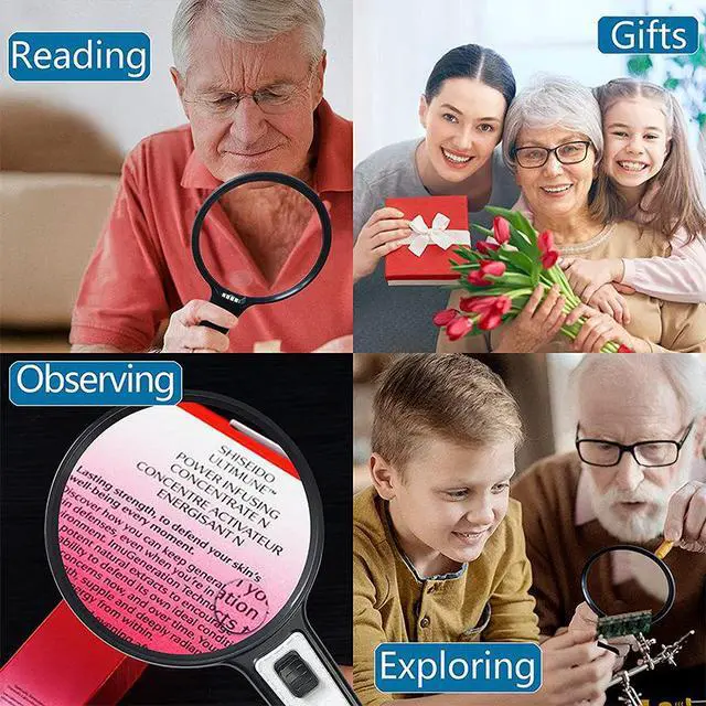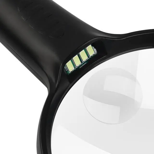 SOEWIOU 98110 magnifier adopts high-definition optical acrylic lenses with 10X magnification and 110mm large diameter. The dual lens design provides clear viewing, built-in LED lights for bright illumination, lightweight and ergonomic. Perfect for reading, jewelry appraisal, repair work, inspection and elderly daily use.