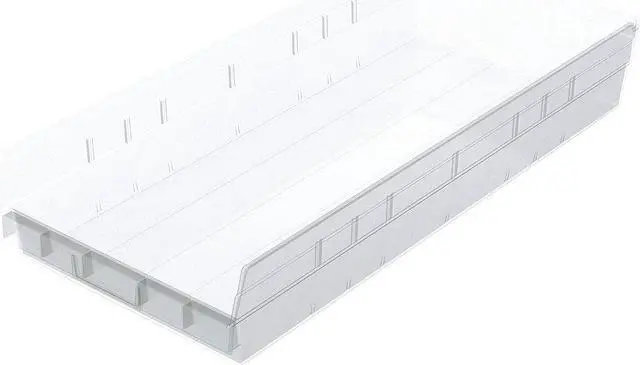 Constructed from durable plastic material, this shelf storage bin offers robustness and longevity. Its clear color allows for quick identification of contents without the need to rummage through or empty out the bin. Despite having no divider slots, it can safely handle a load capacity up to a maximum stacking weight of about twenty pounds.
