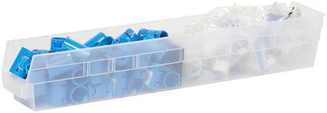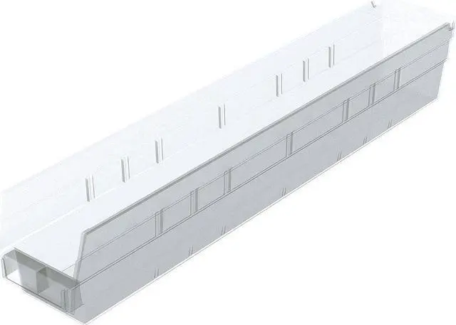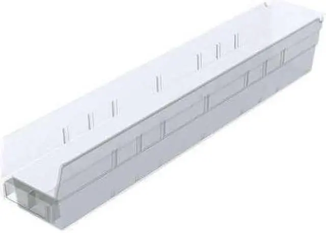 The AKRO-MILS - 30124SCLAR Shelf Storage Bin is a stationary storage solution designed for businesses that require organized storage. The bin measures an overall length of 23 5/8 in, width of 4 1/8 in and height of 4 in, providing ample space with an inside length of 22 1/8 in, width of 3 in and height of 4 in. With a volume capacity of approximately .14 cubic feet, this shelf storage bin can comfortably hold up to a load capacity of about twenty pounds.