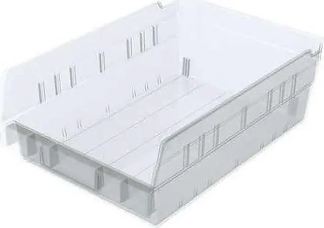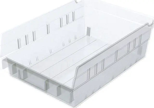 The AKRO-MILS - 30150SCLAR Shelf Storage Bin is a stationary storage solution designed to offer ample space for your items. With an inside width of 7 1/8 in, a height of 4 in, and length of 10 1/4 in, this bin provides sufficient room for various types of goods. The overall dimensions are equally impressive at 11 5/8 in L x 8 3/8 in W x H with a volume capacity of .16 cubic feet. This bin is also hangable and nestable, offering versatility when it comes to organizing your workspace.