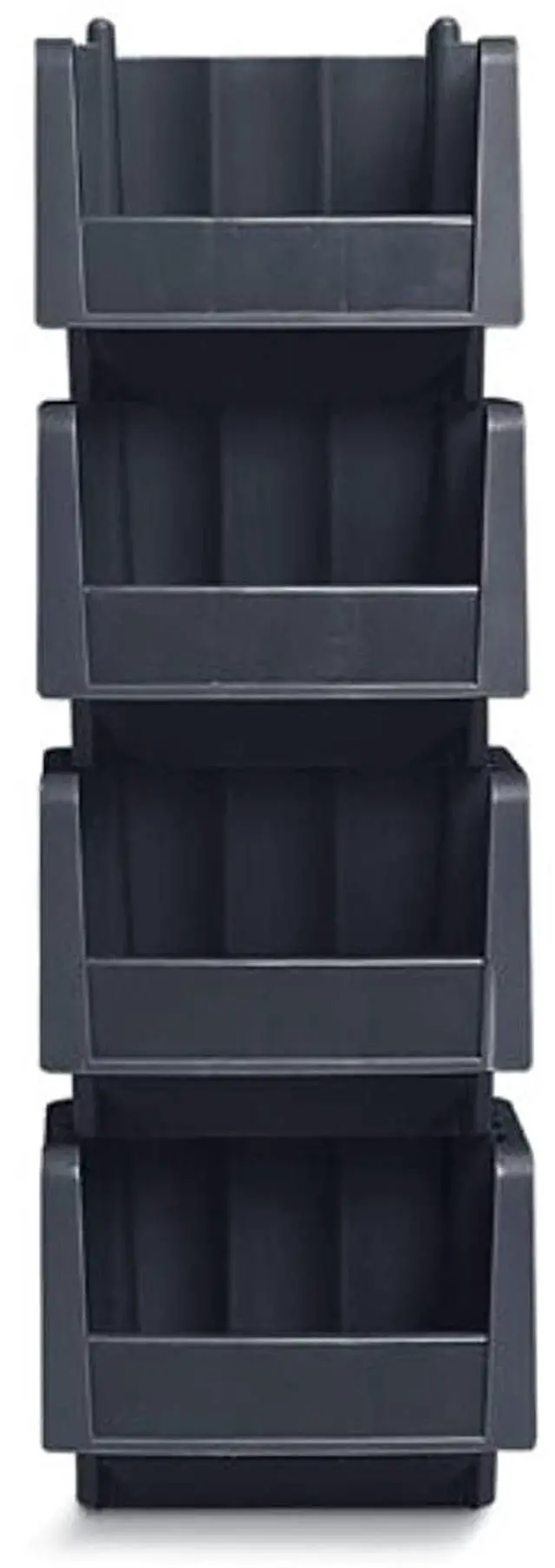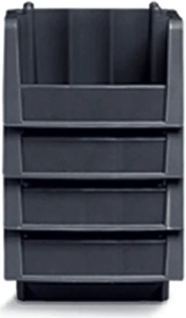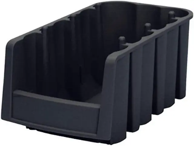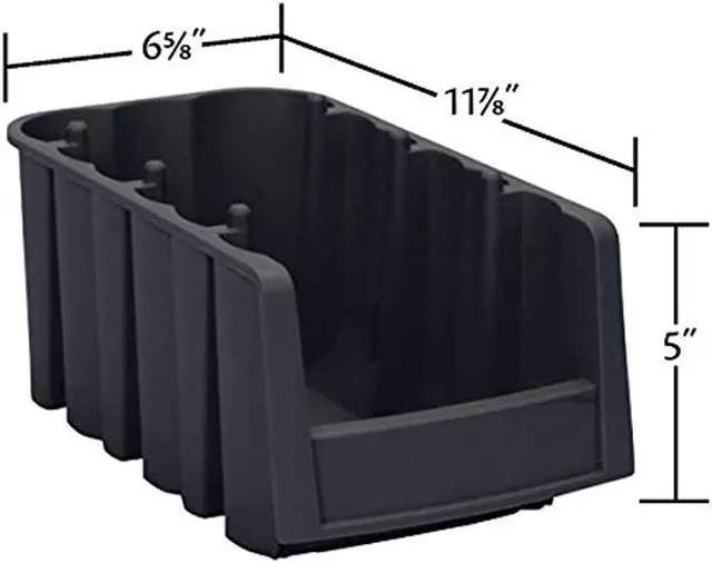 The AKRO-MILS - 30716BLACK Hang & Stack Storage Bin is a rectangular, hopper type bin with precise dimensions to suit your storage needs. With an inside width of 4 inches, length of 9 3/25 inches and height of 4 9/10 inches, this bin offers adequate space for various items. Its overall measurements are equally impressive; standing at a height of 5 inches, extending to a length of 11 7/8 inches and spreading out to a width of 6 and 5/8 inches. The design allows for efficient use in compact spaces while providing ample capacity.