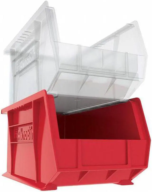 The AKRO-MILS - 30240RED Hang & Stack Storage Bin is a robust and versatile storage solution, designed to optimize space in your work area. With an overall length of 14 3/4 inches, width of 8 1/4 inches, and height of 7 inches, this bin provides ample interior space for storing items. The inside dimensions are also generous with a length of 14 inches, width of nearly 6.5 inches and height just under seven inches. This stationary bin can be conveniently stacked or hung as per the user's preference.