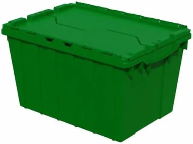 Attached Lid Tote, Container Wall Type Solid, Fork Pockets Fork Pockets Not Included, Includes Lid Lid Included, Material Plastic, Maximum Operating Temperature 140 Degrees F, Minimum Operating Temperature -5 Degrees F, Body Color Green, Lid Color Green, Nestable Nesting Capable, Overall Height 12 1/2 in, Overall Length 21 1/2 in, Overall Width 15 1/4 in, Resistant To Alkali, Corrosion, Rust, Water, Weak Acid, Stackable Stacking Capable, Stacking Capacity 260 lb, Volume Capacity 12 gal. This item has been restricted from sale in the following state (s): []