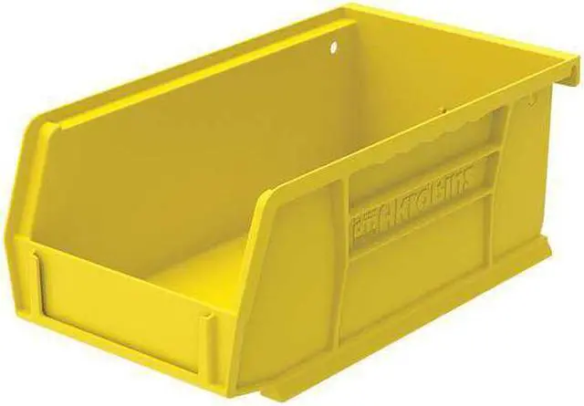 This hangable and stackable storage bin is crafted from durable plastic material. It comes in a bright yellow color which can aid visibility when identifying stored items quickly. The bin features one divider slot providing users the flexibility to organize their contents as needed. Included are molded slots for ID labels and a label holder assisting you further with item identification or categorization tasks.