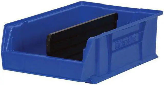 The AKRO-MILS - 30280BLUE Storage Bin is a stationary storage solution designed with ample space for various items. With an inside width of 10 11/16 inches, an inside height of 5 3/8 inches and an inside length of 16 7/8 inches, the bin provides sufficient room to store goods securely. The overall dimensions are equally impressive at a length of 20 in, a height of six in and a width of about over twelve in. Moreover, it has three divider slots that can be used to create separate compartments within the bin.