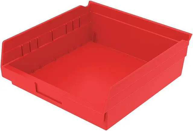 Constructed from durable plastic material, this shelf storage bin is designed to withstand regular use while maintaining its structural integrity. Its vibrant red color adds visibility making item identification simpler. Notably, the bin includes molded-in label area and label holder which aids organization by allowing clear labeling for quick reference. Despite having no divider slots, the volume capacity stands at approximately .23 cubic feet offering considerable room for storage.