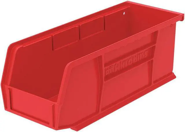 Crafted from durable plastic material, this red-colored storage bin boasts sturdiness and longevity suitable for regular usage. It features one divider slot that aids organization by allowing segregation within the same unit. Additionally, it comes with molded slots for ID labels along with a label holder which facilitate easy identification and retrieval of stored items.