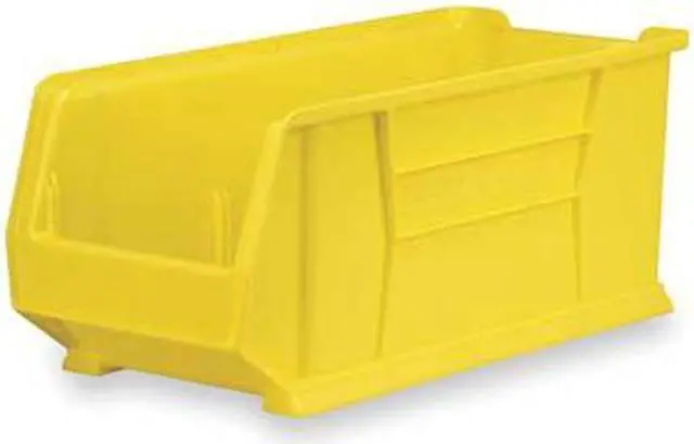 Made from durable plastic material, this yellow storage bin is designed to withstand daily use without compromising its integrity. Its stackable feature enables efficient utilization of vertical space as it can support up to150lb when stacked. Despite its stationary nature, it includes a handle that aids movement when necessary. Additionally, it features three divider slots enhancing item segregation within the bin and comes with a label area on the front for easy identification.