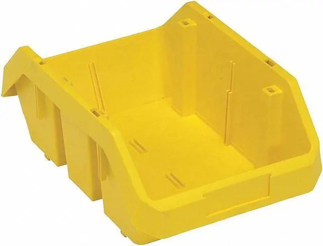 Stacking Bin Item Cross-Stacking Bin, Outside Height 6 1/2 in, Outside Length 14 in, Outside Width 9 1/4 in, Inside Height 6 1/8 in, Inside Length 14 in, Inside Width 7 in, Load Capacity 75 lb, Volume Capacity 0.2 cu ft, Color Yellow, Material Polypropylene, Use Divider No. LD1496, Mfr. No. DUS952, ESD Conductive No