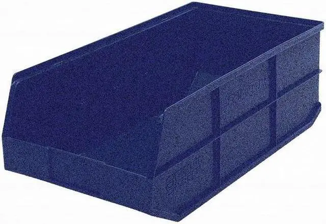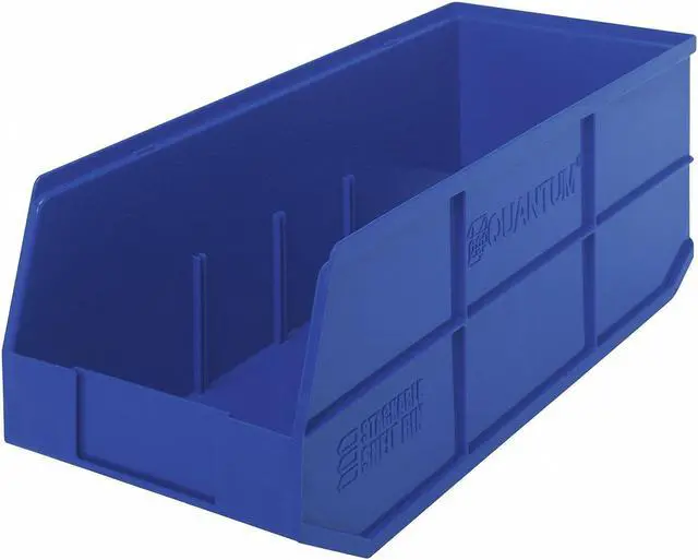 This blue-colored shelf storage bin includes a label holder which aids organization and quick identification of contents. Although it does not feature divider slots or nestability, its volume capacity stands at approximately .68 cubic feet making it suitable for holding numerous items without occupying much space. For optimal functionality, this item is compatible with Mfr No DSS403 units from Quantum Storage Systems.. This item has been restricted from sale in the following state(s): []