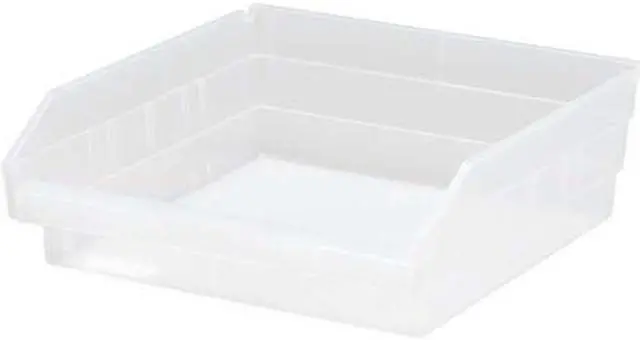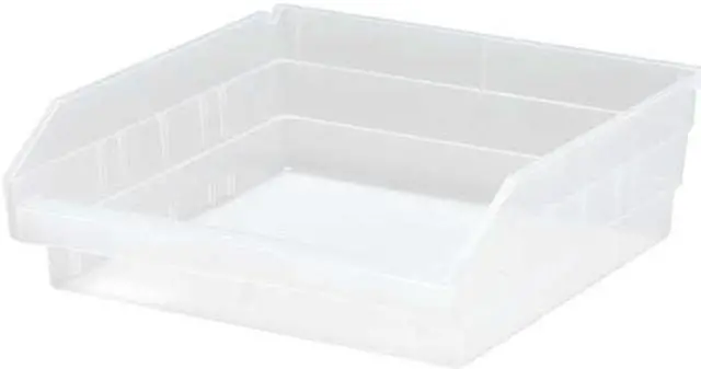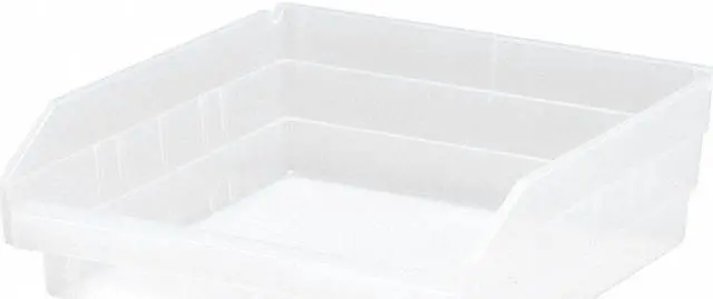 Shelf Bin, Color Clear, Includes Dividers No, Includes Label Holder Yes, Material Plastic, Maximum Operating Temperature 250 Degrees F, Overall Height 4 in, Overall Length 11 5/8 in, Overall Width 11 1/8 in, Stackable No, Weight Capacity 50 lb, Mobility Stationary, Nestable Yes, Number of Divider Slots 7, Number of Long Divider Slots 0, Number of Short Divider Slots 7, Number of Dividers 0, Caster Wheel Diameter Not Applicable, Divider Adjustment Increments Not Applicable. This item has been restricted from sale in the following state (s): []