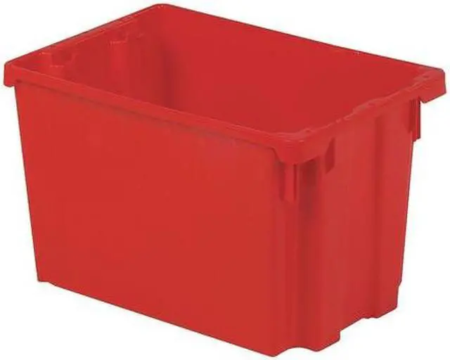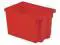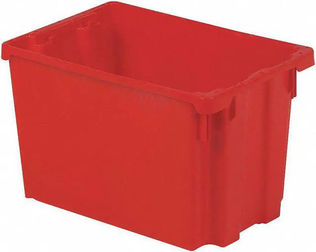 This hang and stack storage bin is constructed from plastic material that contributes to its durability and resilience in various conditions. It comes in red color which can be suitable for sorting or identifying items based on color-coding systems used by businesses. Additionally, this item includes a lid providing coverage for stored items and contributing further towards organized storage practices.