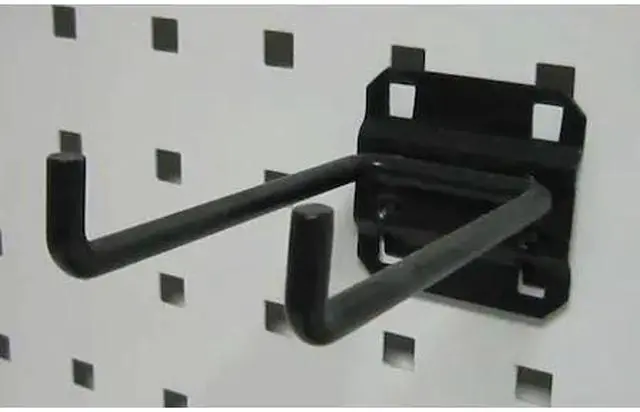 Double Rod Pegboard Hook, Overall Length 4 1/2 in, Overall Width 2 1/4 in, 1 1/2 in For Pegboard Hole Spacing, For Pegboard Hole Size 3/8 in, Surface, Screw-In Locking System, Square For Pegboard Hole Shape, Steel, Black, 90-Degree Double Rod Hook Accessory Type, Package Quantity 5. This item has been restricted from sale in the following state (s): []