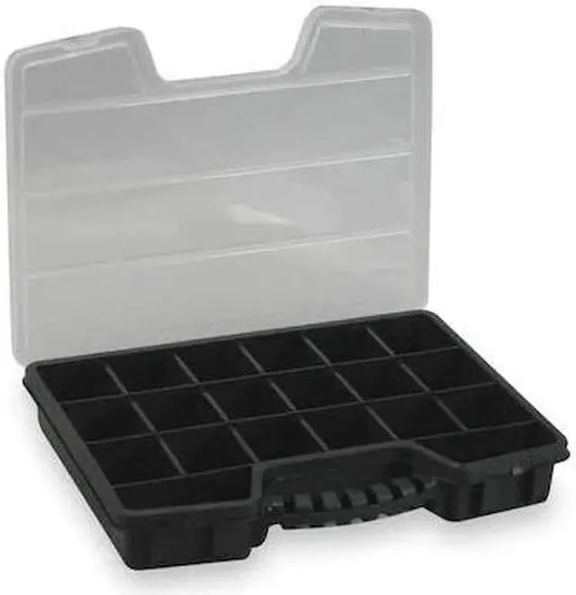 Compartment Box, Color Black, Electrostatic Discharge Not Electrostatic Discharge Conductive, Material Plastic, Maximum Number of Compartments 20, Number of Adjustable Dividers 15, Overall Height 2 1/2 in, Overall Length 12 in, Overall Width 15 3/8 in, Includes Handle Handle Included, Shape Rectangular. This item has been restricted from sale in the following state (s): []