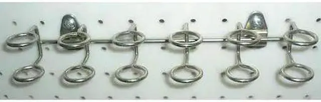 Sub-Category - Pegboard And Slatwall Accessories Tool Holder, Multi-Ring Tool Holder, Overall Width 9 in, Overall Depth 1 3/4 in, Hole Shape Round, Mounting Type Screw In, Hole Size 1/4 in, Hole Spacing 1 in, Material Steel, Color Silver, Load Capacity 10 lb, Rod Thickness 3/16 in, Bend Angle 0.1563 Degrees, Inside Width 3/4 in, Construction Welded, Finish Bright Zinc, Package Quantity 2. This item has been restricted from sale in the following state (s): []