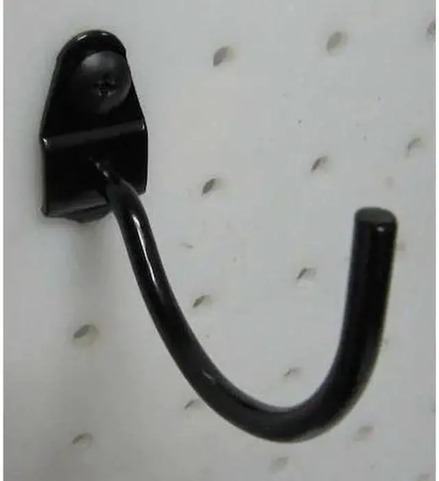 Curved Pegboard Hook, Overall Length 2 1/4 in, Overall Width 3/4 in, 1 in For Pegboard Hole Spacing, For Pegboard Hole Size 1/4 in, Surface, Screw-In Locking System, Circle For Pegboard Hole Shape, Steel, Black, Curved Hook Accessory Type, Package Quantity 10. This item has been restricted from sale in the following state (s): []