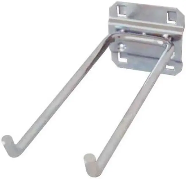 Sub-Category - Pegboard And Slatwall Accessories Hook, Double Rod Pegboard Hook, Overall Depth 4 in, Hole Shape Square, Mounting Type Screw In, Hole Size 3/8 in, Hole Spacing 1 1/2 in, Material Steel, Color Silver, Rod Thickness 1/4 in, Bend Angle 90 Degrees, Bend Height 3/4 in, Inside Width 1 5/8 in, Construction Welded, Finish Bright Zinc, Locking System Yes, Package Quantity 5. This item has been restricted from sale in the following state (s): []