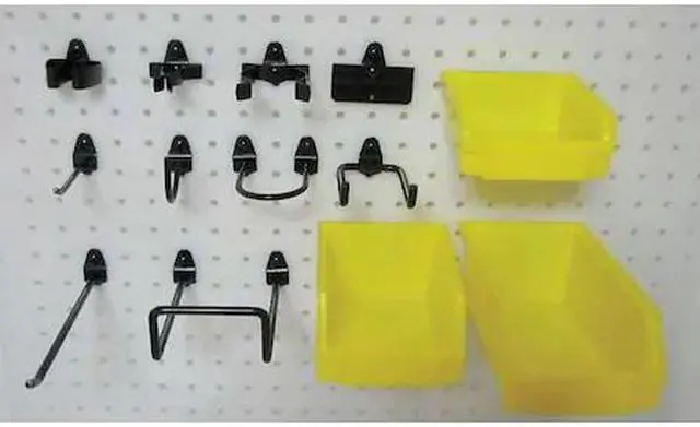 Pegboard Hook Assortment Kit, Number of Hooks 20, 1 in For Pegboard Hole Spacing, For Pegboard Hole Size 1/4 in, Surface, Screw-In Locking System, Circle For Pegboard Hole Shape, Steel, Black, Hook Assortment Kit Accessory Type, (10) 2 1/2 in Single Rods, (10) 2 3/4 in Double Rods, (10) 6 in Single Rods, (10) Extended Spring Clips, (10) Plastic Hanging Bin Clips, (10) Standard Spring Clips, (5) Large Extended Spring Clips. This item has been restricted from sale in the following state (s): []