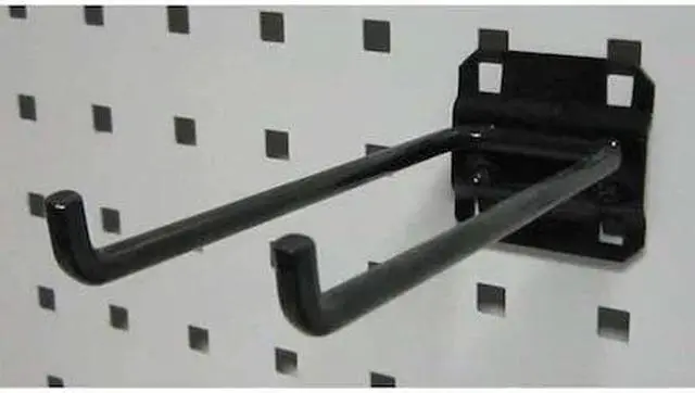 Sub-Category - Pegboard And Slatwall Accessories Hook, Double Rod Pegboard Hook, Overall Depth 5 3/4 in, Hole Shape Square, Mounting Type Screw In, Hole Size 3/8 in, Hole Spacing 1 1/2 in, Material Steel, Color Black, Rod Thickness 1/4 in, Bend Angle 80 Degrees, Bend Height 3/4 in, Inside Width 1 5/8 in, Construction Welded, Package Quantity 5. This item has been restricted from sale in the following state (s): []