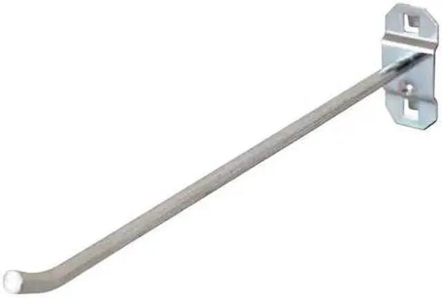 Sub-Category - Pegboard And Slatwall Accessories Hook, Single Rod Pegboard Hook, Overall Depth 8 in, Hole Shape Square, Mounting Type Screw In, Hole Size 3/8 in, Hole Spacing 1 1/2 in, Material Steel, Color Silver, Rod Thickness 1/4 in, Bend Angle 30 Degrees, Bend Height 1/2 in, Construction Welded, Finish Bright Zinc, Locking System Yes, Package Quantity 5. This item has been restricted from sale in the following state (s): []