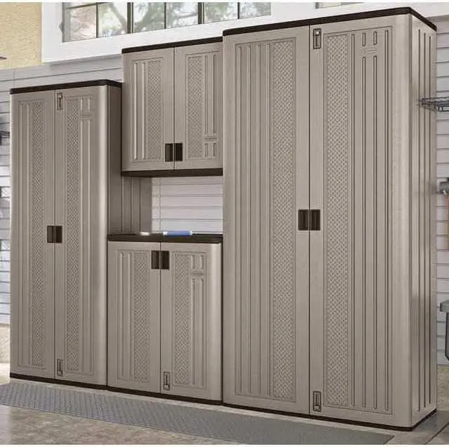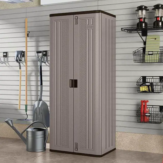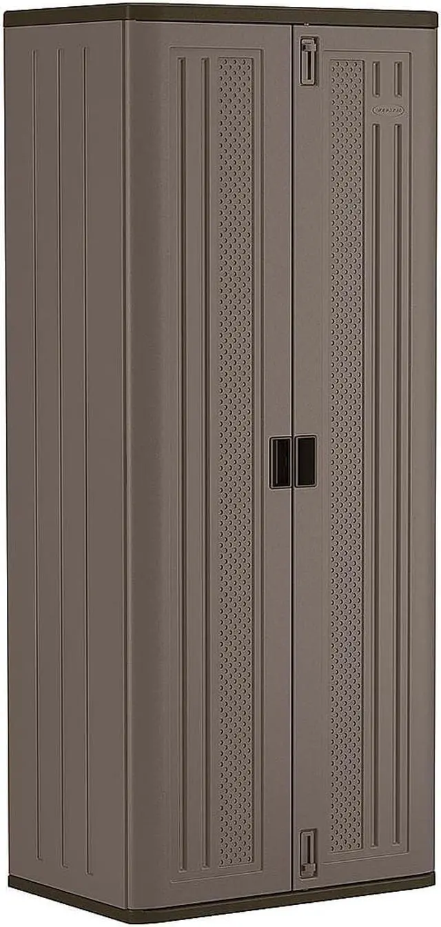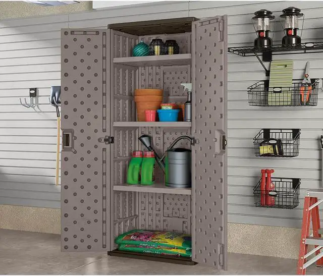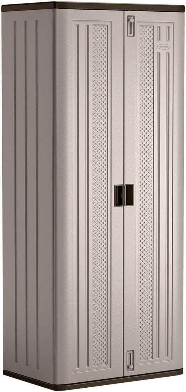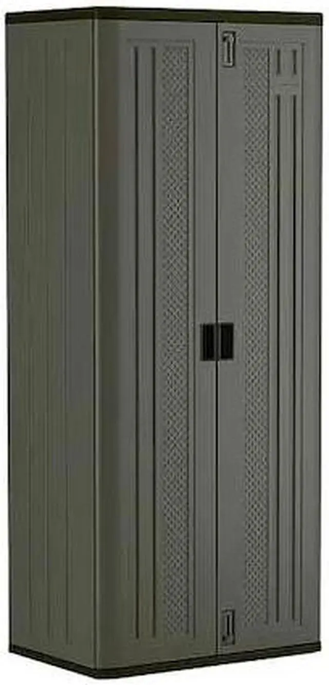 Storage Cabinet, Base Type Frame, Body Panel Type Solid, Cabinet Color Platinum/Slate, Cabinet Material Resin, Cabinet Storage Components Shelves, Door Handle Type Recessed Pull, Door Type Solid, Duty Rating Light Duty, Frame Assembled Unassembled, Load Capacity per Shelf 75 lb, Lock Type Padlock Hasp, Mobility Stationary, Mounting Location Freestanding, Number of Shelves 3, Overall Depth 20-1/4 in, Overall Height 72 in, Overall Width 30 in, Audit Trail Storage None