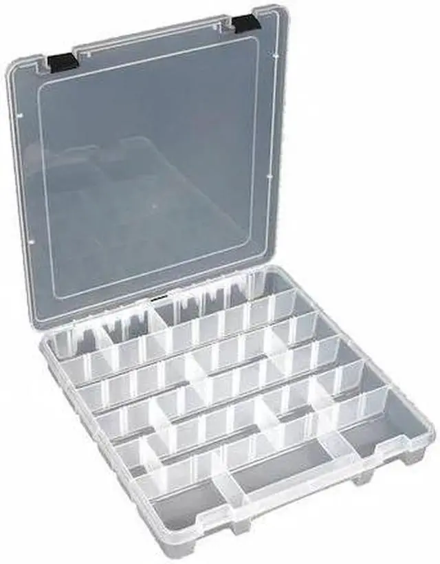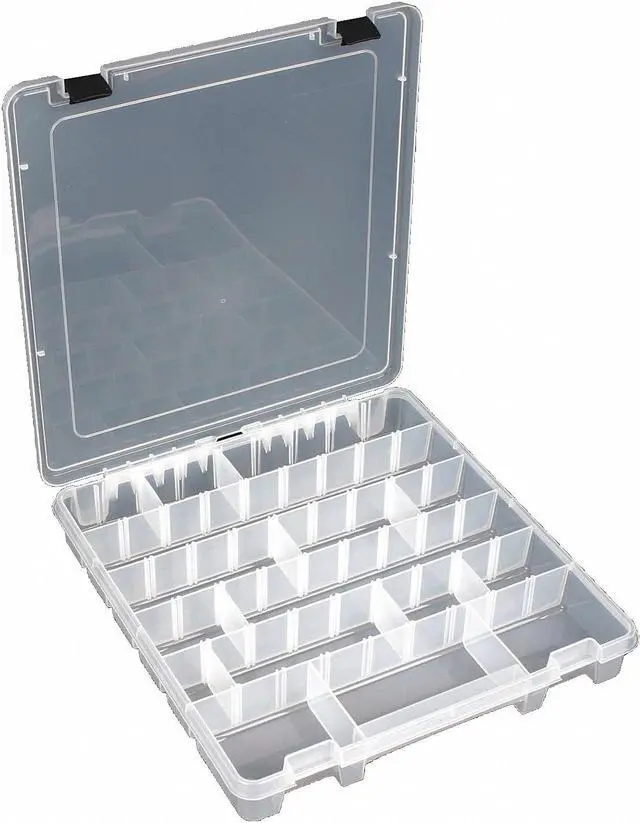Compartment Box, Closure Type Mechanical, Color Clear, Compartment WxD 14 in x 15 in x 2 in, Electrostatic Discharge Not Electrostatic Discharge Conductive, Material Plastic, Maximum Number of Compartments 8, Number of Adjustable Dividers 20, Overall Height 2 in, Overall Length 14 in, Overall Width 15 in, Number of Fixed Dividers 4, Compartment Depth 1 3/4 in, Compartment Width 13 1/8 in, Includes Handle Handle Included, Inside Height 1 3/4 in, Inside Length 13 1/8 in, Inside Width 13 1/8 in. This item has been restricted from sale in the following state (s): []