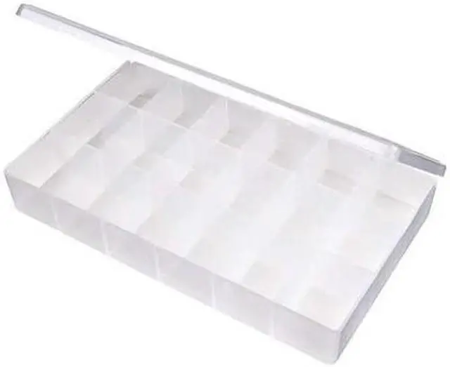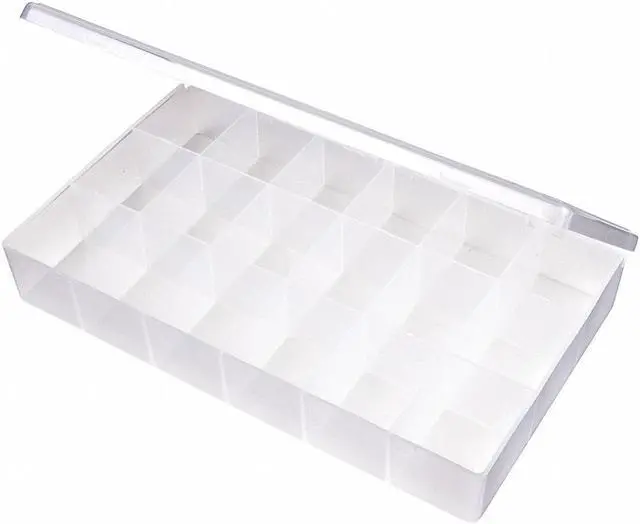 Compartment Box, Closure Type Snap, Color Clear, Compartment WxD (18) 1 3/4 in x 2 1/16 in, Electrostatic Discharge Not Electrostatic Discharge Conductive, Material Plastic, Maximum Number of Compartments 18, Number of Adjustable Dividers 0, Overall Height 1 3/4 in, Overall Length 6 1/2 in, Overall Width 10 3/4 in, Number of Fixed Dividers 7, Compartment Depth 2 1/16 in, Compartment Width 1 3/4 in, Inside Height 1 9/16 in, Inside Length 6 3/16 in, Inside Width 10 1/2 in. This item has been restricted from sale in the following state (s): []