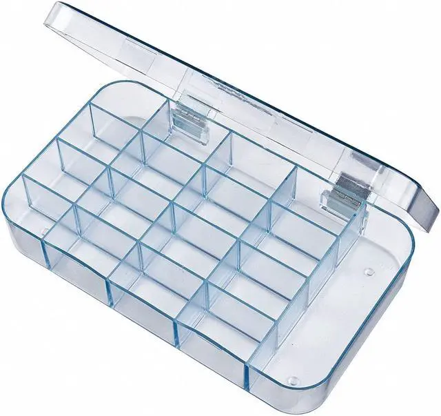 Compartment Box, Closure Type Snap, Color Clear, Compartment WxD 1 3/16 in x 4 in, (16) 1 1/4 in x 7/8 in, Electrostatic Discharge Not Electrostatic Discharge Conductive, Material Plastic, Maximum Number of Compartments 17, Number of Adjustable Dividers 0, Overall Height 1 3/8 in, Overall Length 4 1/4 in, Overall Width 7 1/4 in, Number of Fixed Dividers 0, Compartment Depth 4 in, Compartment Width 7 in, Inside Height 1 1/16 in, Inside Length 4 in, Inside Width 7 in. This item has been restricted from sale in the following state (s): []