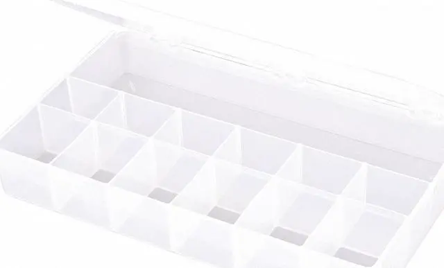 Compartment Box, Closure Type Snap, Color Clear, Compartment WxD 10 3/8 in x 2 5/8 in, (6) 1 11/16 in x 1 5/16 in, (6) 1 11/16 in x 2 in, Electrostatic Discharge Not Electrostatic Discharge Conductive, Material Plastic, Maximum Number of Compartments 13, Number of Adjustable Dividers 0, Overall Height 1 3/4 in, Overall Length 6 1/2 in, Overall Width 10 3/4 in, Number of Fixed Dividers 7, Compartment Depth 2 3/4 in, Compartment Width 10 3/8 in, Inside Height 1 9/16 in, Inside Length 6 3/16 in.