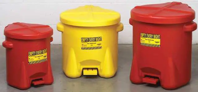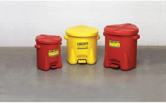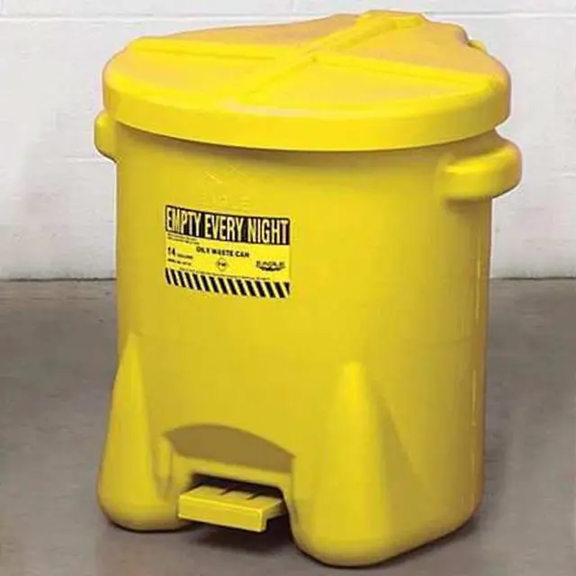 Oily Waste Can, Can Diameter 18 in, Capacity 14 gal, Can Material Polyethylene, Material Finish Not Applicable, Color Yellow, Height 21 in, Length 18 in, Lid Closure Type Foot Operated Self-Closing, For Location Floor, Product Type Oily Waste Can, Standards FM, NFPA, OSHA, Width 22 in. This item has been restricted from sale in the following state (s): []