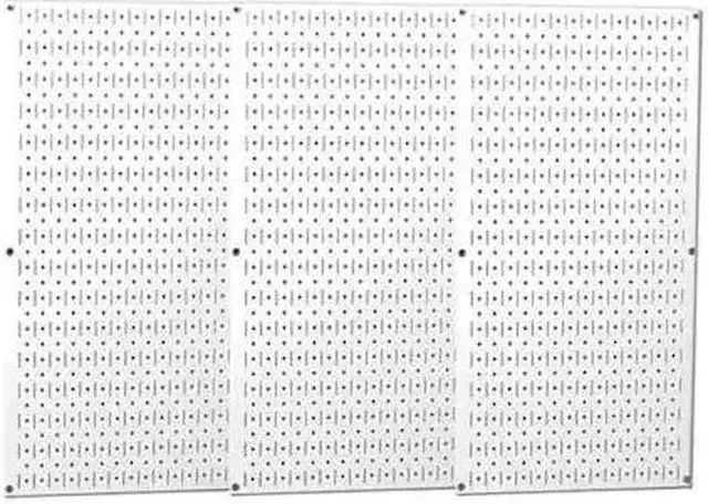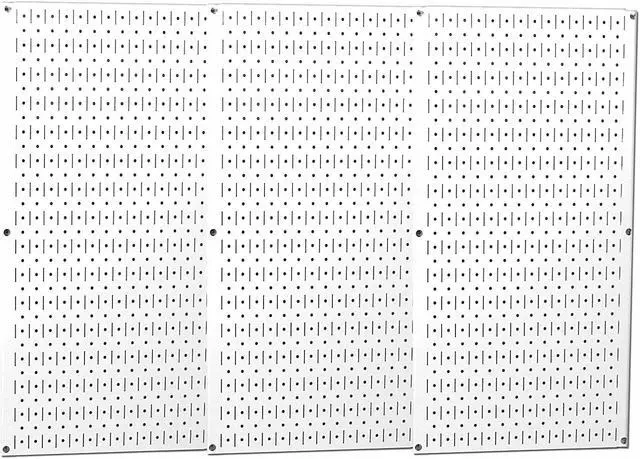 Pegboard Panel, Peg Hole Shape Round, Slotted, Peg Hole Size 1/4 in, 1 in, Peg Hole Spacing 1 in, Panel Pegboard Type, 200 lb Panel Load Capacity, 20 ga Panel Thickness, Overall Depth 3/4 in, Overall Height 32 in, Overall Width 48 in, Storage Area 10 sq ft, Number of Usable Sides 1, Number of Hooks 0, Number of Panels 3, 600 lb Whole Unit Load Capacity, White, Powder Coated, Steel, Includes Mounting Hardware Yes. This item has been restricted from sale in the following state (s): []