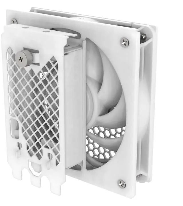 The FDP02 is an adapter bracket that attaches to any tower case with 7 or 8 PCI slots to increase the air movement inside the chassis for optimal PCH, M.2, GPU and other system components temperatures. It comes equipped with a single 120mm fan equipped with hydraulic bearing and a rotational speed of 1500 RPM. A metal fan grill is also attached to prevent any injuries caused by the fan blades during operation.
