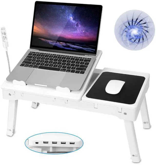 *Upgraded Versatile Laptop Table: Comes with a large mouse pad, a inbuilt perforated cooling fan, a LED lamp with adjustable light wand, 4 x USB 2.0 ports and some inbuilt storage compartments with 4 cm depth. It can effectively protect your laptop and bring you much convenient.