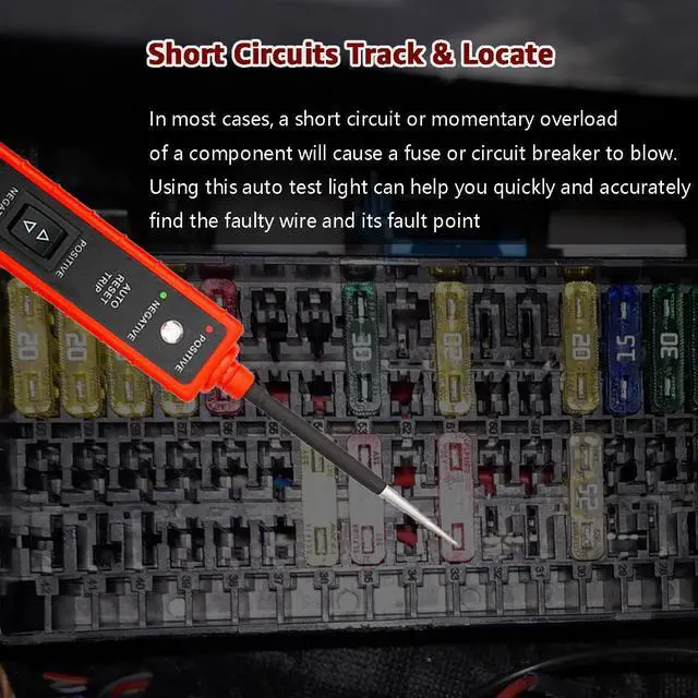[Short Circuit Tracking and Locating] In most cases, a short circuit or momentary overload of a component will cause a fuse or circuit breaker to blow. Using this auto test light can help you quickly and accurately find the faulty wire and its fault point
