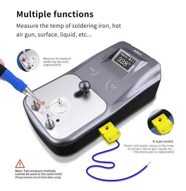 The Aixun DT01 Smart Digital Thermometer is a professional temperature measurement tool designed for electronics repair and calibration tasks. It is widely used to test and verify the temperature of soldering irons, hot air guns, and other heating equipment.