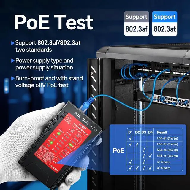 POE Tester: Identifies PoE devices efficiently. Detects crossover methods (unknown/end-span/mid-span/8-core power supply) and polarity. Comprehensive PoE detection, including non-standard, IEEE 802.3AF, and IEEE 802.3AT.