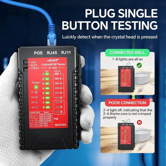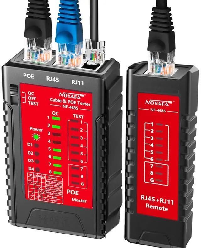 Cable Length Test: NF468S cable tester can be used as a telephone line tester, the maximum test distance is 2000 meters.A low battery indicator will appear when the battery is low to remind the user to replace the battery in time. CAT6 CAT5 cable tester is lightweight and easy to carry.