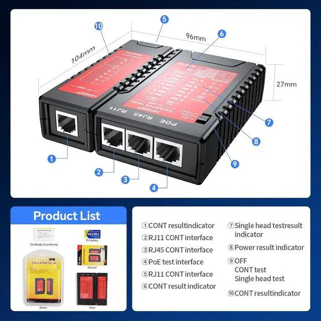 UTP/STP TESTING: Indicator lights on the connected port in the device flash to help locate cables accurately. quickly detect the crimping condition of the crystal head, Shielded network cable can also be used(UTP/STP)