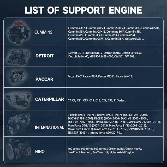 Designed for trucks with major diesel engines. Includes multiple adapters (6/9 pin, CAT-9, CAT-14, 16 pin) for wide compatibility and accurate diagnostics.