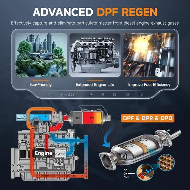 Supports DPF regen, reset, and status control to maintain engine performance and reduce costly replacements. (Not compatible with some models.)