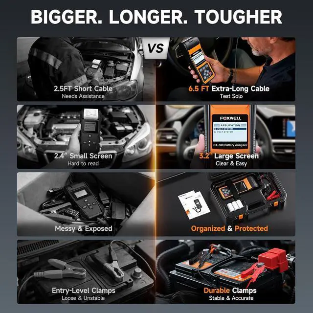 Professional-grade analyzer for 6V, 12V, and 24V batteries (1002000 CCA). Delivers key readings including voltage, SOC, SOH, and internal resistance, plus cranking and charging tests to quickly identify system issues.