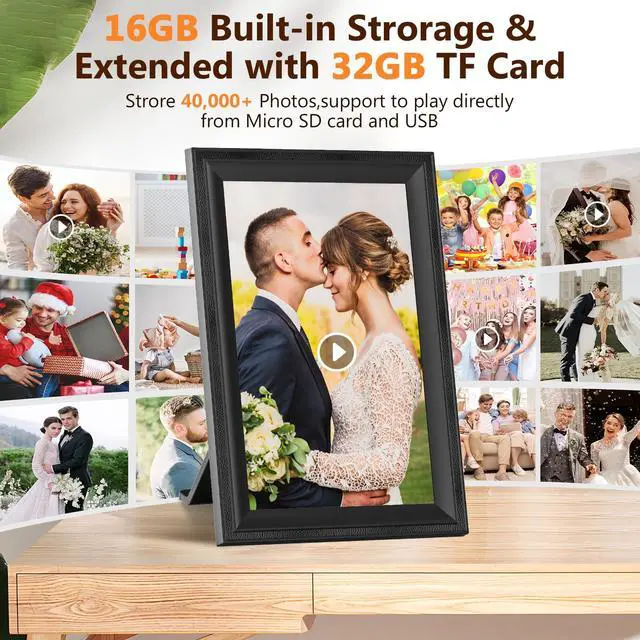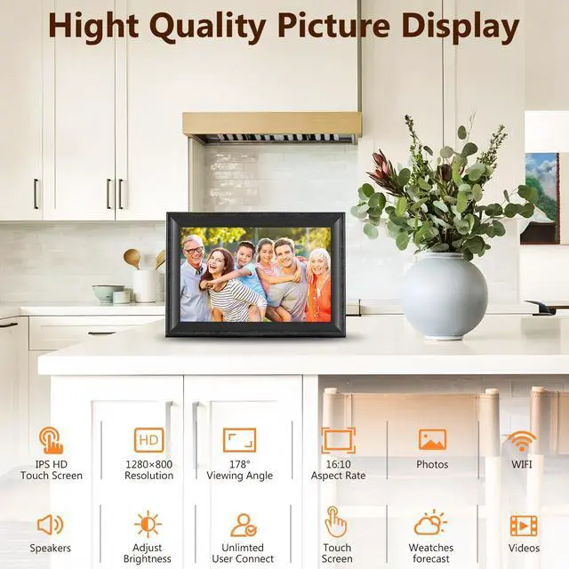br>HD IPS LCD screen extraordinary picture qualitydigital picture frame is designed with high-quality hd 1280*800 resolution.picture quality is super clear and brighter.10.1'' ips touch screen 16:10 ratio,178° viewing angle with wide viewing angles and superior color fidelity.digital photo frame also supports multiple image formats including jpg/jpeg/bmp/png,video format by mp4,photo picture frame digital will bring you unlimited visual and auditory enjoyment