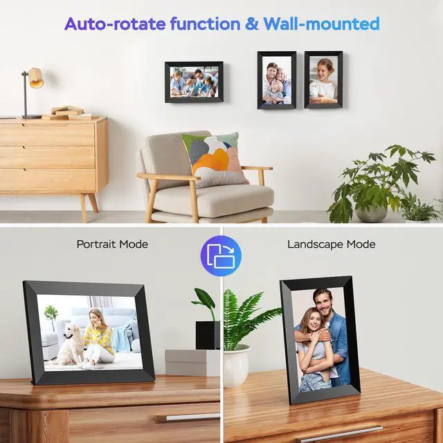 The WiFi digital photo frame loaded through Uhale App can automatically rotate photos to adjust the direction, and comes with a detachable stand as a photo frame stand, allowing you to view photos in portrait or landscape mode. The same digital photo frame can also be wall mounted to display titles, weather and clock, play sequence, image zoom, hide/publish images, adjustable brightness, slide show Photo withdrawl and instant and scheduled blessing functions allow you to better share wonderful moments and send love messages