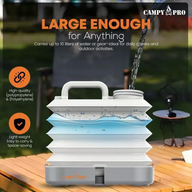 Campy Pro Foldable Water Tank 10L Portable Collapsible Water Container for Camping, Hiking & Emergency Use; Stay hydrated on any adventure with the Campy Pro Foldable Water Tank, your reliable and eco-friendly solution for outdoor hydration. This 10L collapsible water container is ideal for camping, hiking, backpacking, traveling, festivals, or emergency water storage. It folds flat when empty to save space in your backpack or camping gear. Crafted from durable, BPA-free, food-grade materials, this portable water container keeps your drinking water safe and clean. The wide-mouth opening allows quick filling, easy pouring, and fast cleaning, while the strong carry handle ensures effortless transport. Whether you're deep in the wilderness, prepping a survival kit, or just enjoying a weekend off-grid, this foldable water tank is built for outdoor convenience. Perfect as a camping water container, festival jug, or backup water supply. Lightweight, compact, and reusablethis is smart hydration gear you can count on. Thank you for choosing Campy Pro your adventure companion.