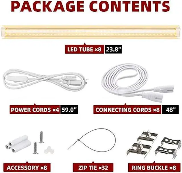 Package include - 8 x 2 foot grow light, 4 x 59'' power cord, 8 x 48'' connector cable, 8 x small connector, 32 x zip tie, 16 x ring buckle, 16 x screw, 8 x end cap. Our grow light has 2 years warranty, easy and fast replacement is offered if any quality issue