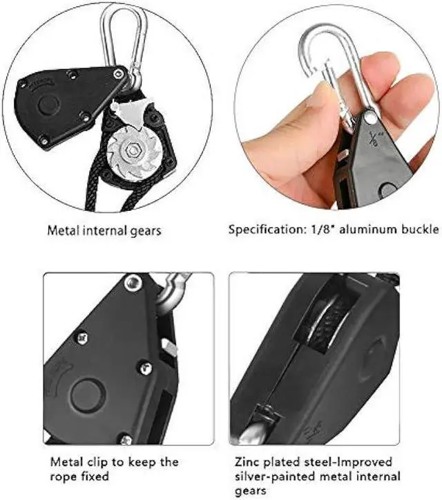 Multiple applicationWork as an adjustable rope hanger or locking pulley. Perfect for hanging light fixtures, reflectors, carbon filters, fan, ventilation equipment and so on.