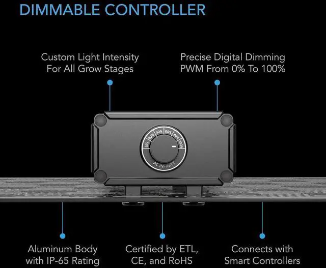 • Dimmer enables 0 to 100% brightness. Can connect with our smart controllers to access grow cycles, scheduling, and app.