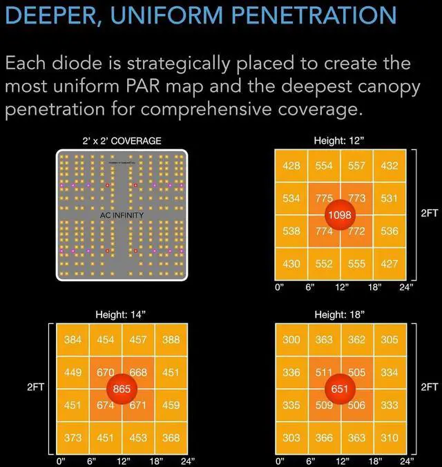 • Algorithmically positioned diodes create the most uniform PAR map and the deepest canopy penetration.